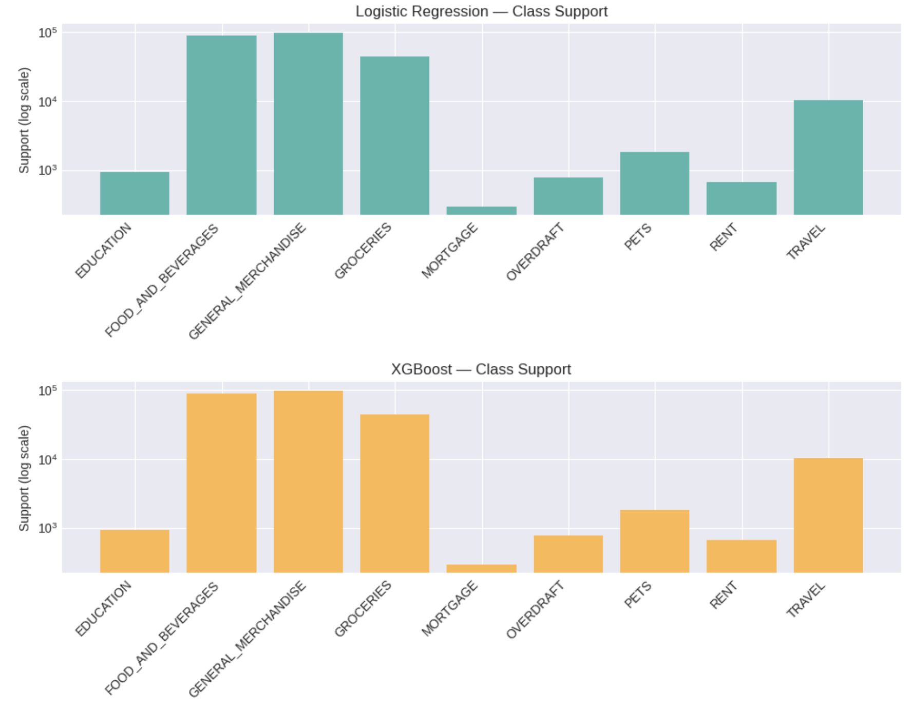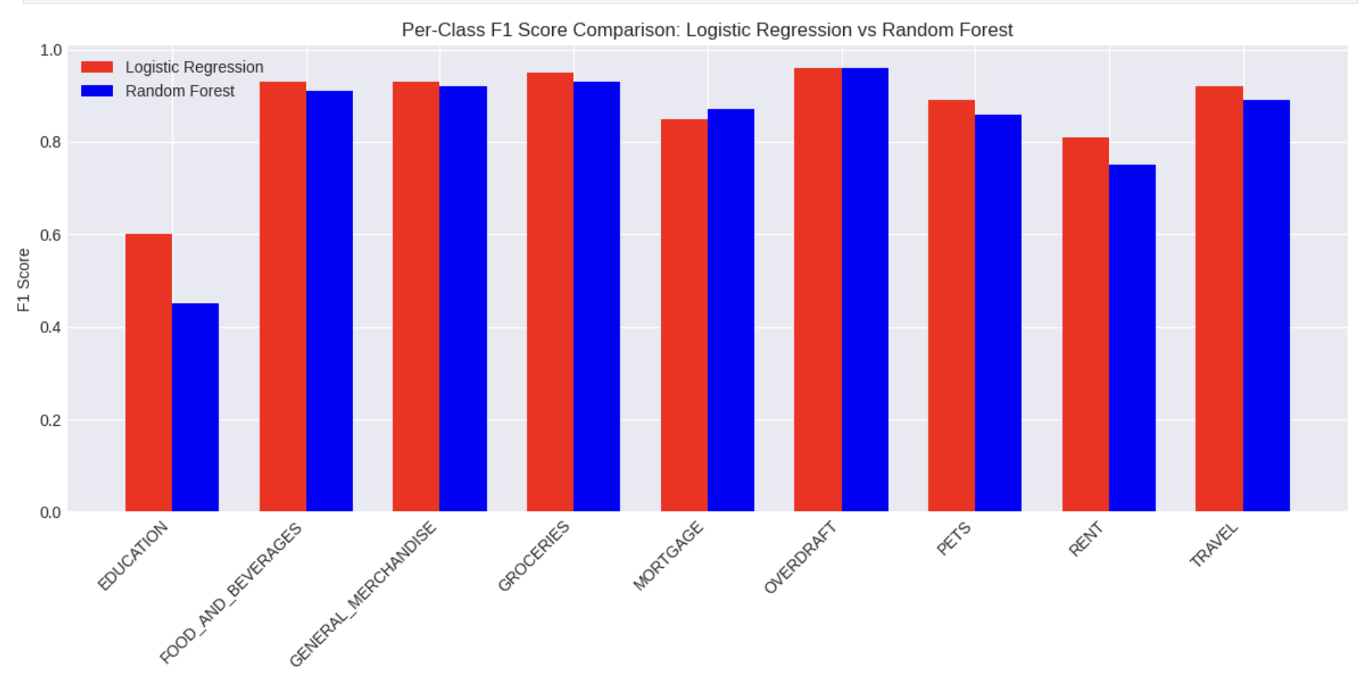 Logistic Regression performs strongly on majority classes but struggles on minority classes, a pattern that holds for Random Forest as well (Figure 1). Generally, Logistic Regression performs better than Random Forest across most of the categories (Figure 2).