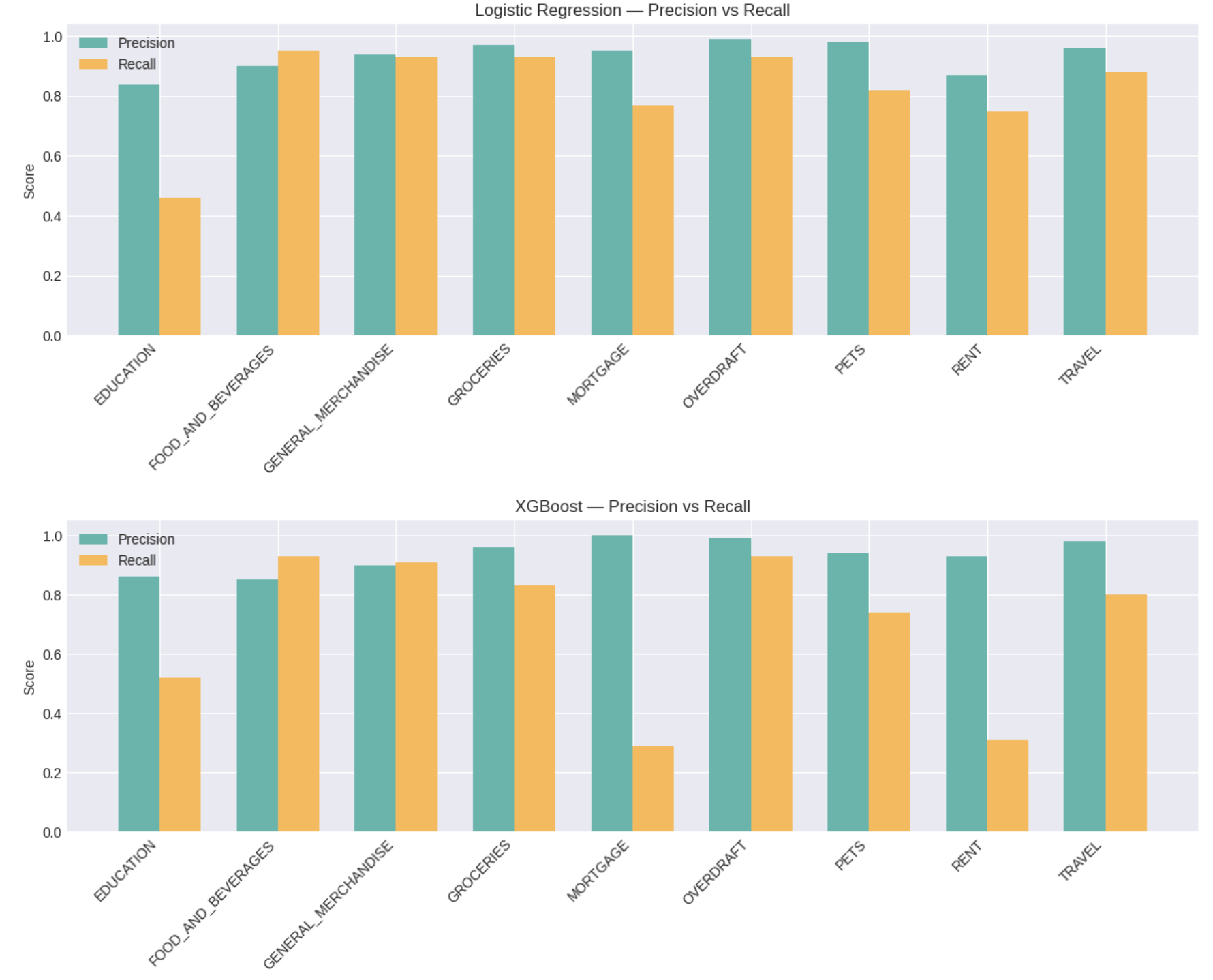 The model did well at identifying Overdraft transactions and high-frequency categories, like FOOD_AND_BEVERAGES and GENERAL_MERCHANDISE but struggled with EDUCATION transactions. The gap between weighted F1 (0.93) and macro F1 (0.87) of 0.06 shows moderate sensitivity to class imbalance, suggesting the model's aggregate performance is inflated by strong results on majority classes.