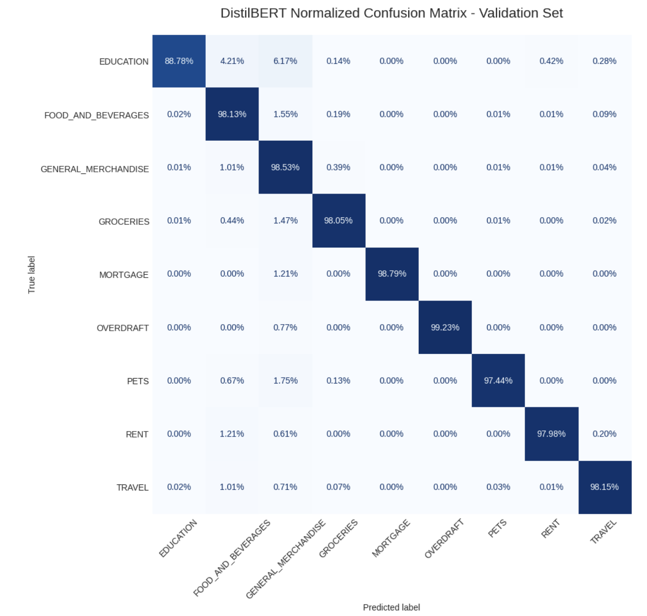 On the validation set, DistilBERT maintained almost perfect performance across most categories (Figure 8). High-frequency categories such as FOOD_AND_BEVERAGES (F1: 0.952), GENERAL_MERCHANDISE (F1: 0.958), and GROCERIES (F1: 0.960) were classified accurately. Even minority classes achieved strong results. The model's weighted and macro F1 scores (0.955 and 0.921, respectively) suggest robustness to class imbalance.