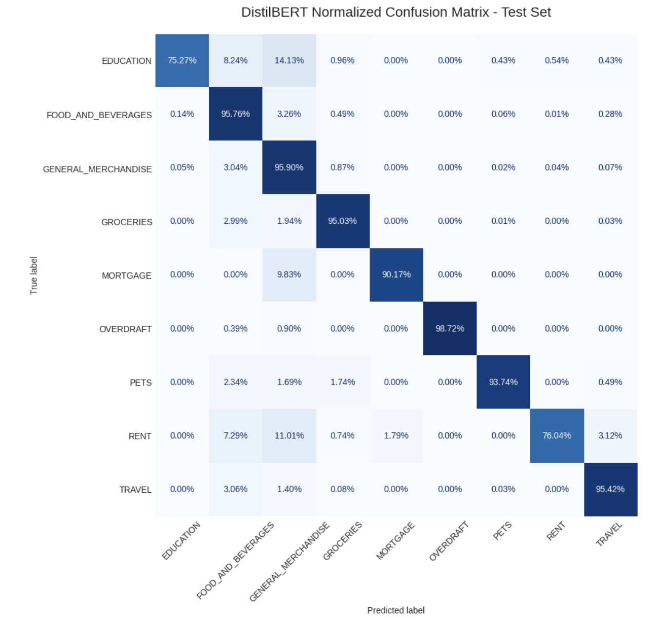 While looking at the test set, we can see that DistilBERT maintained accurate generalization (Figure 9). Overall accuracy was 95.52%, with a weighted F1 of 0.955 and a macro F1 of 0.921. Performance on high-support categories remained excellent: FOOD_AND_BEVERAGES (F1: 0.952), GENERAL_MERCHANDISE (F1: 0.958), and GROCERIES (F1: 0.960). Importantly, DistilBERT also substantially outperformed all other models on minority classes.
